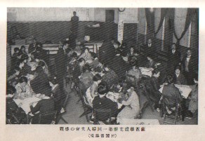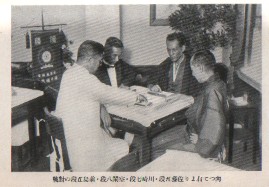 こういう人物であるから、σ(-_-)のような麻雀研究者にとっては、その人となりを知る重要な資料になる。またこの本には、当時の麻雀界の貴重な写真が何枚も掲載されている。たとえば下記は、当時の麻雀界のお偉方の貴重な対局風景。一番右側が佐藤5段、正面着物姿が川崎7段、正面左側が日本麻雀連盟創立者の空閑緑8段、左端の白い洋服が前島吾郎5段である。