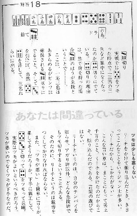 中身は、全編、見開きの左ページの上部に何切る的な牌姿を上げ、下段に戦術論を記している。