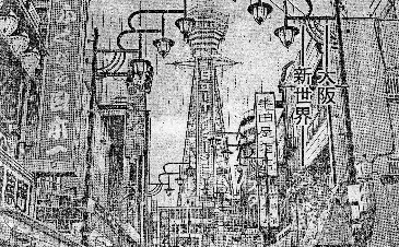 このアングルは通天閣が正面に見えるので、いちばんポピュラーなアングル。σ(-_-)も新世界に行ったとき、同じアングルで写真を撮った。ほら、左側の「ふぐ日本一」とか、右側の「半田屋酒店」という看板まで同じ。