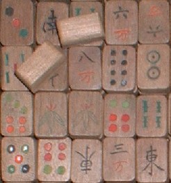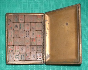 商品として製造されたもなのか、個人が麻雀やりたさの一心で制作したものか、ちと不明。しかし入れ物がタバコ入れだったり、牌の大きさが不揃いなので、どうみても素人制作。しかし木材のカット面はなめらかで、とても素人がナイフやのこぎり片手にゴリゴリというレベルではない。彫りも職人はだし。