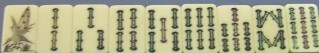 となれば何か彫らなければいけないが、“白”の装飾枠が単なる額縁状の枠ではなく胡蝶になっている。胡蝶の装飾自体は他にも例があるが(「麻雀の歴史と文化」(麻雀博物館の図録)でいえば、No.37(p80)とかno.39(p84)の万子牌など)、珍しい部類に属することに間違いない。そこで所有者の同意を得て、この牌を白胡蝶牌と命名した次第。