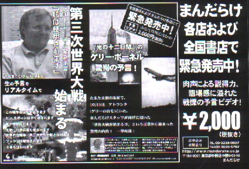 この予言はまんだらけのスタッフが別な取材でボーネル氏にインタビューしているとき、突然、始まったという。驚いたスタッフが、この重大予言を世界に伝えるために急遽ビデオにして発売することにしたそうだ。う~ん、なんとも....