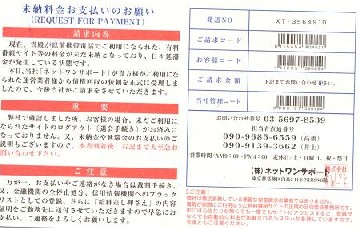 そんな話をしながら、(それにしても、いくら請求が来たのかな?)と請求欄を見ると、そこには「下記にお問い合わせください」とあるだけだった。その「下記」とは、このイカサマ葉書の差し出した架空会社。そして担当者と称する人物の携帯番号も書いてある。もちろんこの会社番号なるところに電話しても、「いま出ているので、直接担当者の携帯に電話してください」というメッセージが流れるだけなんだろう。