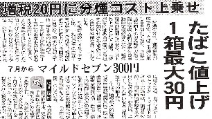 「愛煙家をねらい打ちするとは、実にケシカラン」と、大いに怒りたいところであるが、実は5/6を以て禁煙した。なのでいくら値上げになろうと痛くも痒くもない。(-_-; といっても値上げは