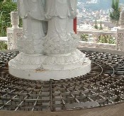 おお、それは! ぜひ登ってみようというので、さっそく観音像にむかった。観音像の中に入るのは無料であるが、観音像を出るときに喜捨を行う。足下にある入り口から観音像の中に入ると、階段は こんな感じ。ものすごく急で、ロートルには こたえた。(T_T)