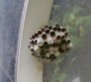 どうやらアシナガバチの1種。性質はスズメバチに比べればおとなしく、巣を刺激しなければまず刺してはこない(そうだ)。たしかに かなり近寄って観察しても、襲われたことはない。