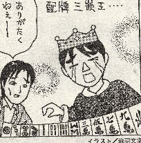 今月号(06.12.15)のそのコラムは、手牌に連続嵌張(   )と辺張( )、あるいは三連続嵌張(   2)と辺張( )があった場合、何を切り落としていった方がテンパイ効率がいいかというような事がテーマ。そのコラムにあった、赤羽文学さんのイラストがコレ。