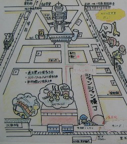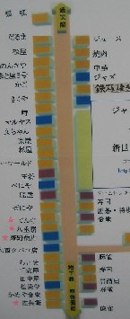 横丁の東側(右側)の下の方、焦げ茶色の印がいくつかある。これが下から和光、新南陽、通天閣クラブの各雀荘。三共は横丁から少しはずれたところで営業している。この中で通天閣クラブが温泉会館に次ぐ老舗と云われるが、じっさいじゃんじゃん横丁の中で最も大きな店でもある。