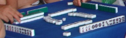 ソーズ抜き麻雀のルールは以前にもお話しましたが、最初の親は   で を引いた人がなります。あとは その局でアガった人が親になります。したがって場風はありませんが、自風はあります。でも前の局でアガった人が親(東家)になるせいで、自風を勘違いしやすいです。自動卓のようにフリサイした人の前のランプが点灯すればいいのですが、手積み卓なので そういうことも起きるのだと思います。