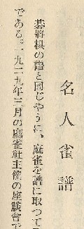 また戦前、雀鬼と謳われた沼崎雀歩(ぬまざきじゃんぽ)も、その麻雀論「理論的麻雀打法」(s6.3)で、雀譜と表現している。しかし戦前は記録をとること自体が少なかった。そこで雀譜という表現はとくに定着しなかった。