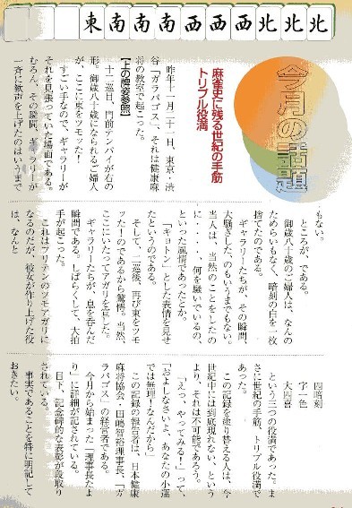 ダブル役満くらいなら、いくらでもある。σ(-_-)1人に限っても、2回は経験している。トリプル役満となればさすがに珍しい。もちろん膨大なゲームを誇るネット麻雀の世界では、数は少ないまでも何回も記録されている。しかしリアルとなると、風の便りというか、ウワサに聞くことはあっても、確証も何も無い話でしかない。