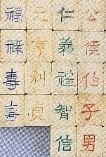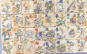 AD1928年、榛原茂樹(はいばらしげき)*7が北京の天橋*8で入手した牛骨製の福州牌は、風牌が無い代わりに江村斜影という字牌、三元牌の代わりに晩(赤字)・涼(青字)という牌が存在している。